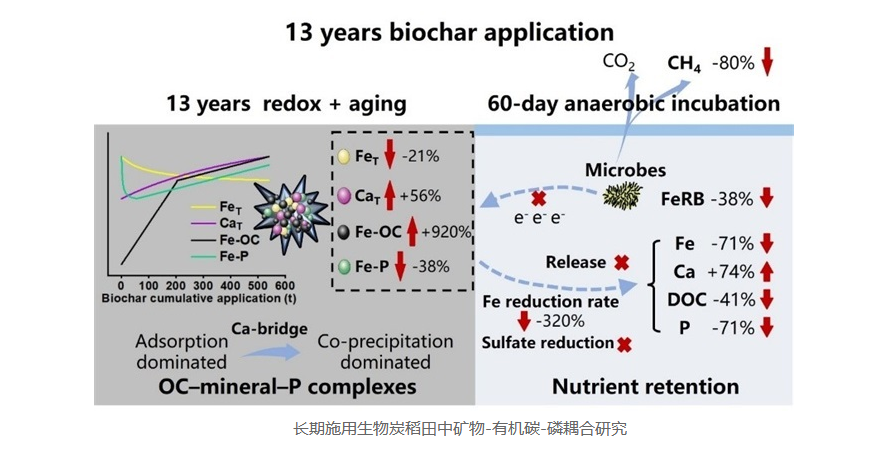 生物炭作为重要的农田调控材料,在提升土壤养分利用效率、缓解气候变化方面具有广阔应用前景。然而,现有研究多聚焦于短期试验,对于其在长期田间管理条件下能否持续实现农学效益与环境效益协同提升,目前仍缺乏系统认知。尤其值得关注的是,生物炭的调控效应受土壤矿物过程与微生物过程共同影响,并随稻田周期性氧化还原变化及pH波动不断演变。因此,从长期尺度系统解析生物炭驱动的矿物-有机碳-磷耦合机制,成为评估其可持续应用潜力的关键科学问题。