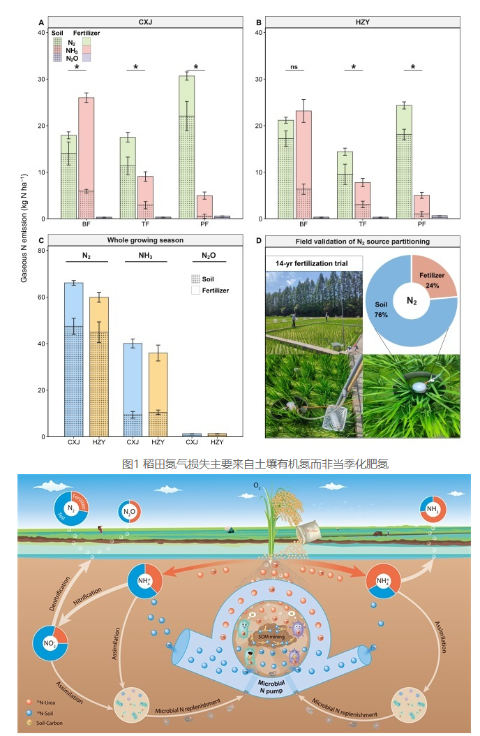 长期以来,学界普遍认为稻田N2排放主要来自施用的化肥氮,这一假设被广泛用于全球氮收支评估和模型模拟,但始终缺乏直接证据支撑。针对这一科学难题,研究团队创新性地将15N同位素示踪与膜进样质谱技术相结合,构建了稻田气态氮损失原位观测方法体系,首次实现了在完整水稻生长季内对N2、氨气(NH3)和氧化亚氮(N2O)排放的同步测定,并精准解析其来源。研究结果显示,稻田N2排放中有72%–75%来源于土壤有机氮,而非当季化肥氮,这一结论在长达14年的长期定位试验中得到独立验证。相比之下,NH3排放主要来源于化肥,N2O则由土壤和化肥共同贡献。研究还发现,N2与NH3排放在季节上呈现“跷跷板”效应:分蘖前期氮损失以NH3挥发为主,分蘖后期及穗肥期则转为N2排放主导。